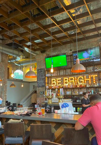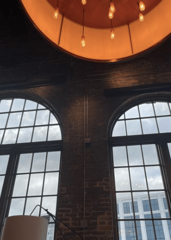 Pre-dinner drinks at Proof Brewing Co. – the former 32,000 square foot Coca-Cola bottling factory featuring a modern tasting room, covered patio and expansive lawn.
